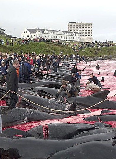 The people of Faroe Islands should hang their heads low in shame. The sea is stained red and it’s not because of the climate effects of nature.